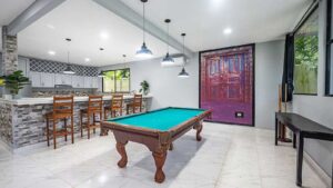 The spacious living area includes a pool table and large kitchen and the rear of the house hosts a private pool and outdoor shower. All 18 bedrooms are equipped with mini split air conditioners, bedroom sets and artwork. Most rooms have a private bathroom and a few share a jack and jill bathroom.
